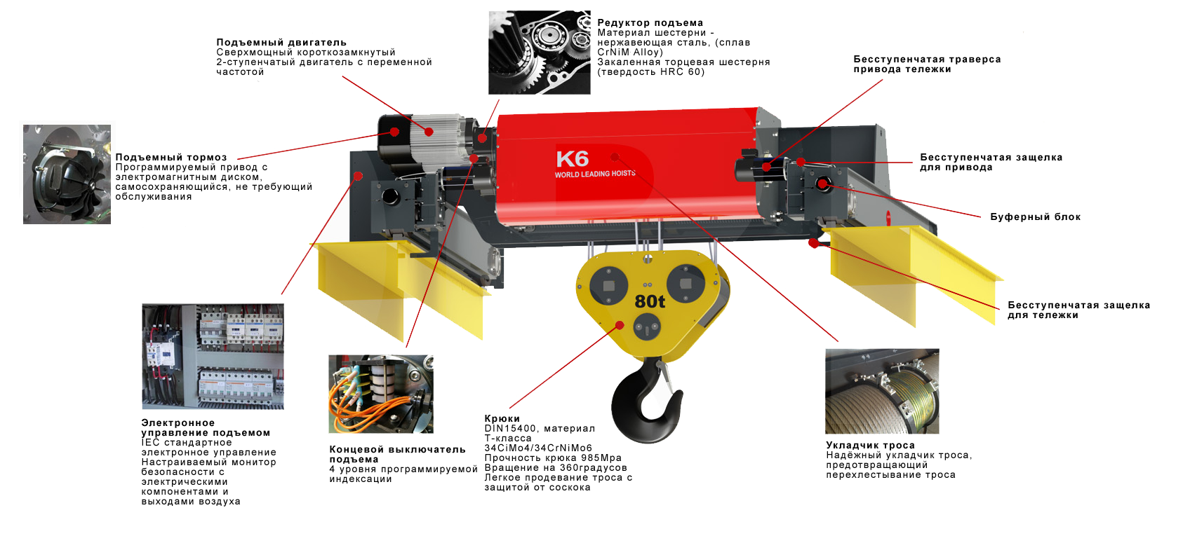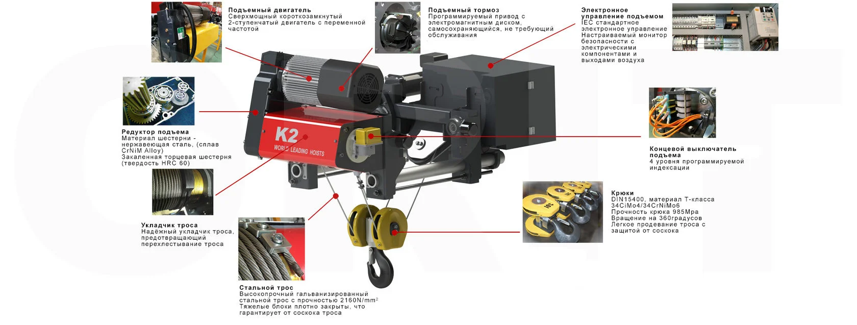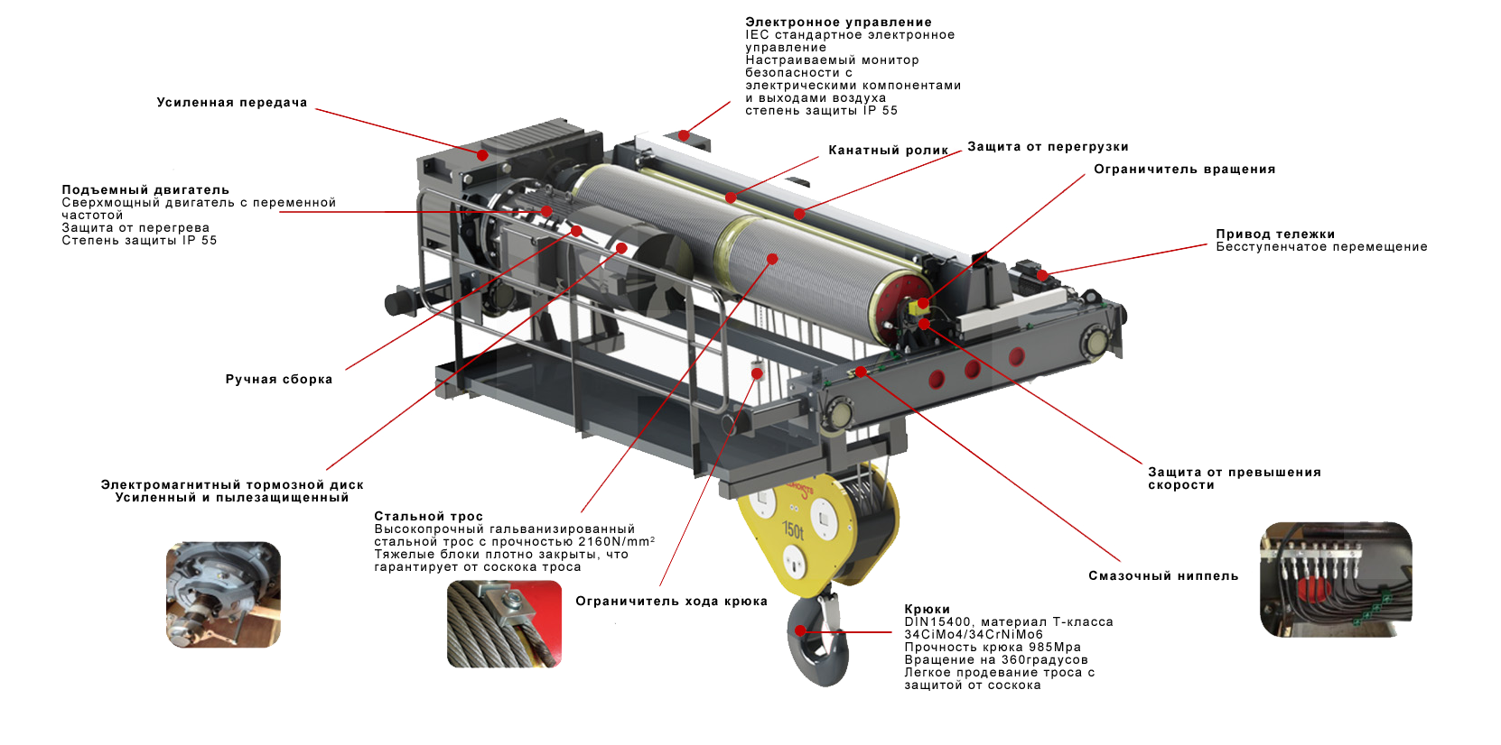Барабан увеличенного диаметра снижает отклонение крюка и продлевает срок службы стального каната на тяжелых режимах работы. Встроенная защита от перегрева, перегрузки и падения обеспечивает безопасную эксплуатацию подъемного оборудования.