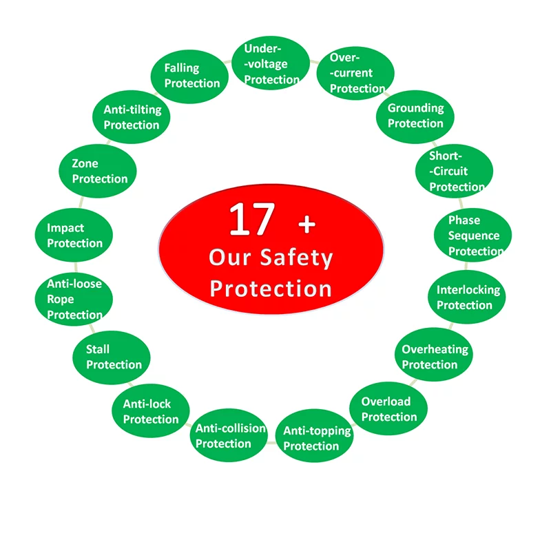 Комплексная защита включает защиту от столкновений, ограничение рабочей зоны, контроль тормозной системы, защиту от бокового натяжения и ослабления троса. Предотвращение ударных нагрузок минимизирует воздействие резких стартов и остановок.