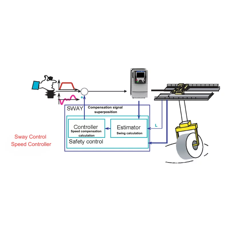 На основе принципа компенсации движения система снижает раскачивание более чем на 90%. Электронная система контроля в реальном времени отслеживает длину подвеса и начальную скорость, рассчитывает синтезированную скорость для подавления раскачивания по заданной математической модели и передает данные в инвертор, обеспечивая безопасную работу.