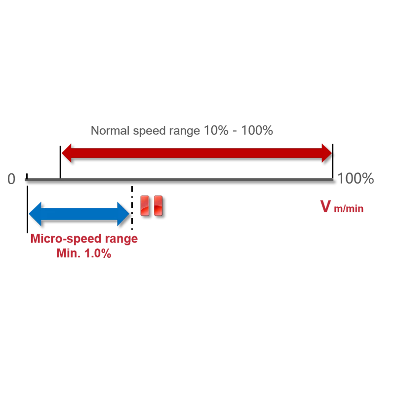 Номинальная максимальная скорость снижается до желаемой ограниченной скорости для точного контроля движения груза (1–99% от номинала). Например, если номинальная скорость 0–5 м/мин, а микроскорость установлена на 30%, груз будет двигаться в диапазоне 0,05–1,5 м/мин. Это исключает резкое движение, обеспечивает точное позиционирование и защищает ценные грузы.